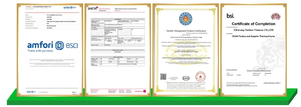 Oleme järjest saanud mitmeid autoriteetseid sertifikaate, sealhulgas ISO 9001 kvaliteedijuhtimise, BSCI/SMETA sotsiaalse vastutuse ja Higgi indeksi keskkonnasäästlikkuse kohta.